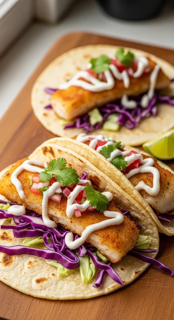 Place the fish inside warm tortillas and serve immediately. Add simple toppings if you like, or keep it basic for a quick, no-fuss dinner.