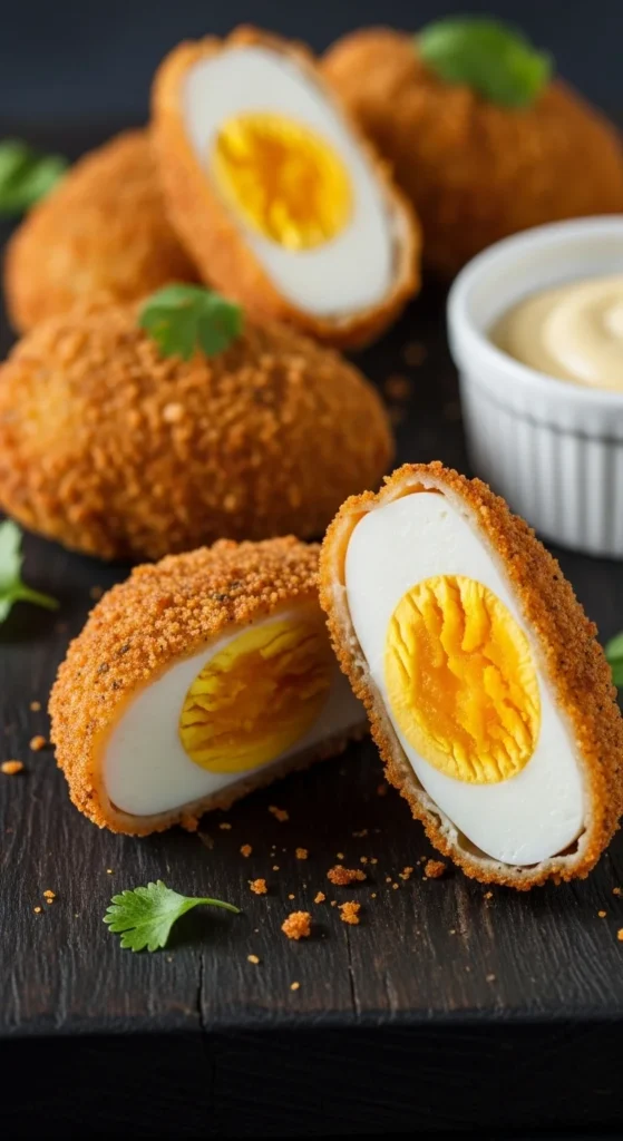 - Dip each ball into beaten egg, then coat with breadcrumbs.