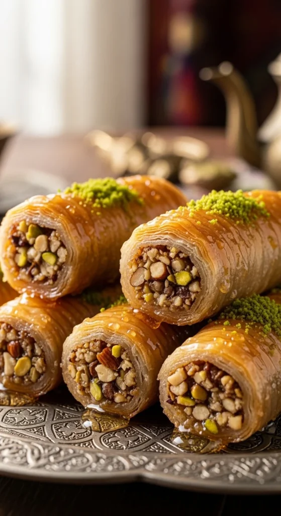 Honey Baklava Rolls bring delicate sweetness and beautiful texture to an Eid dessert table. Thin pastry layers bake into crisp golden bites while nuts add richness. Because they store well, many hosts prepare them ahead to avoid last minute stress. Guests often enjoy them with tea while conversations continue after dinner.