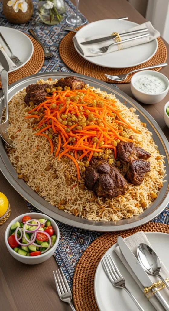 Kabuli Pilaf looks stunning the moment it reaches the table. Sweet carrots and raisins contrast with savory rice and tender meat, creating layers of flavor in every spoonful. Guests often remember it because of its colorful topping and gentle sweetness. It feels festive without being overly spicy, making it perfect for mixed age groups at Eid gatherings.