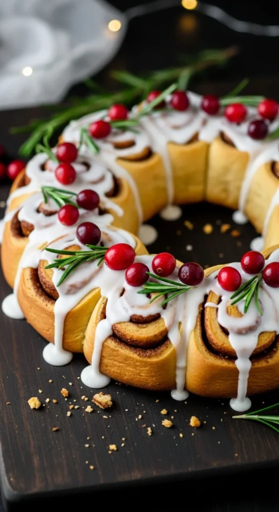 Place the wreath on a wooden board and scatter cranberries around it. Add rosemary sprigs for color. Dust with powdered sugar for a snowy touch. Serve warm so the icing melts gently. A side of hot cocoa or spiced tea works beautifully. Bright holiday plates add charm.