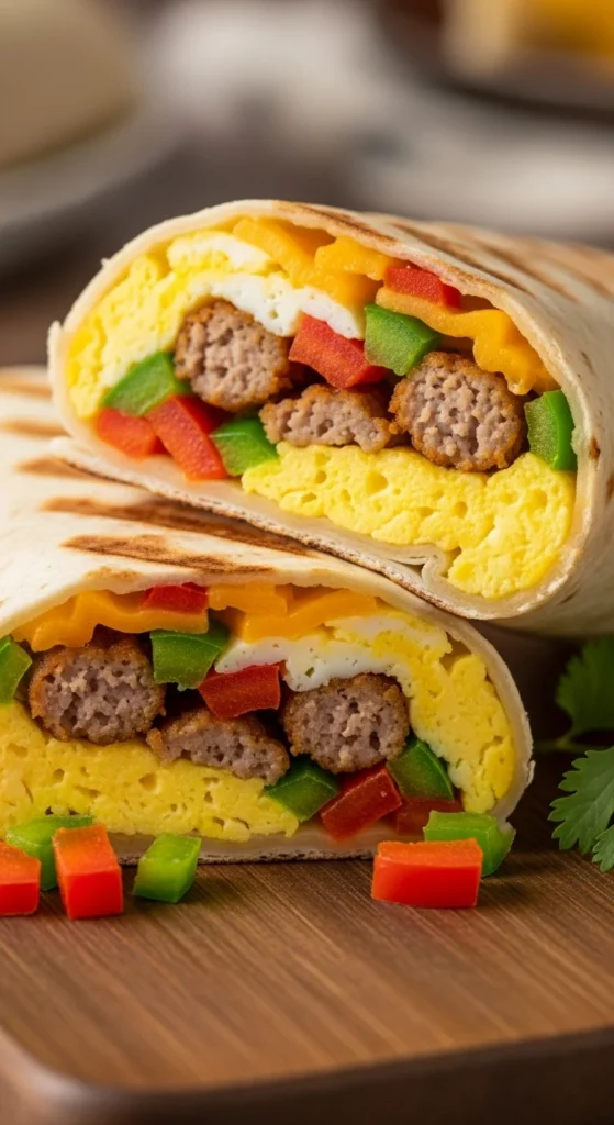 Breakfast burritos are hearty and easy to take on the go. The eggs and sausage create a filling base while vegetables add flavor. Everything wraps neatly inside a warm tortilla. They can be made ahead and reheated easily. Perfect for a busy or relaxed morning.