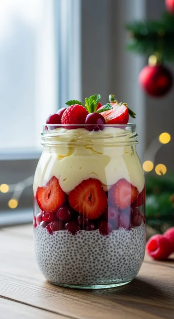 This chia pudding is creamy, simple, and nutritious. The vanilla flavor makes it feel like a treat while still being light. Preparing it the night before makes mornings easier. The berries add festive color. It works for both kids and adults.