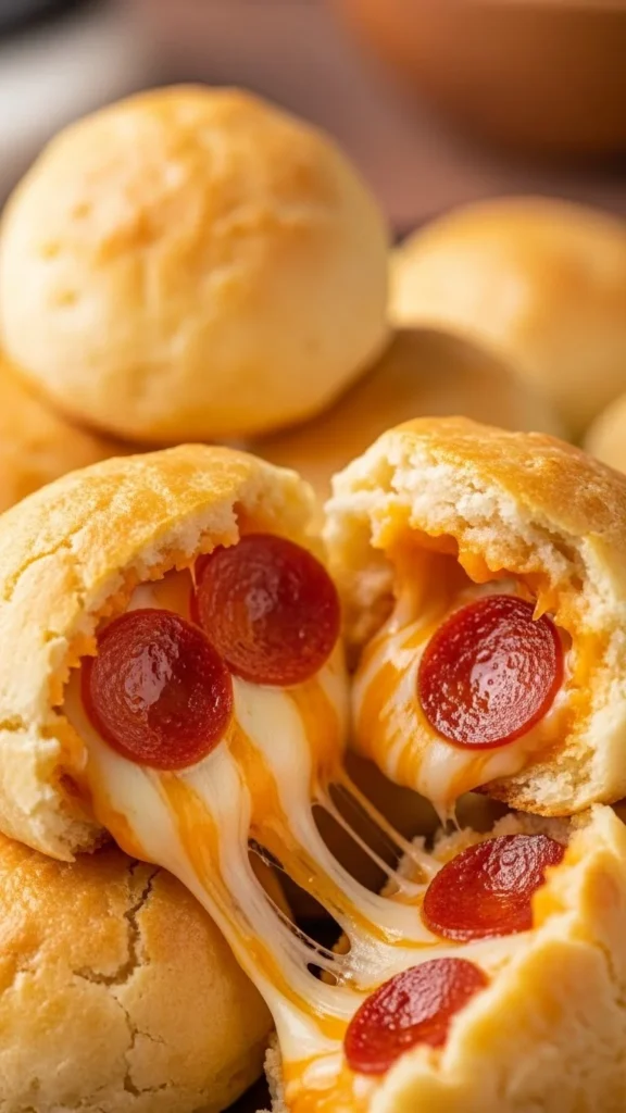 These bites are soft, cheesy, and fun. The pepperoni melts into the cheese, creating a warm pizza flavor inside each biscuit. Great for feeding kids and adults alike.