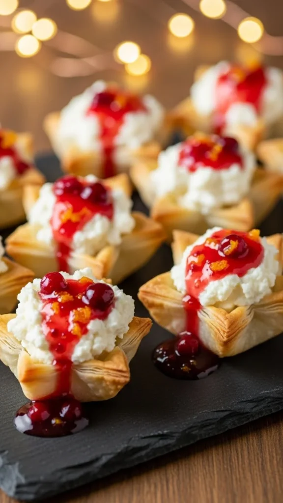 These phyllo stars are bright, creamy, and festive. The whipped feta adds richness, while the cranberry orange topping brings sweet citrus flavor. They look beautiful and taste refreshing.