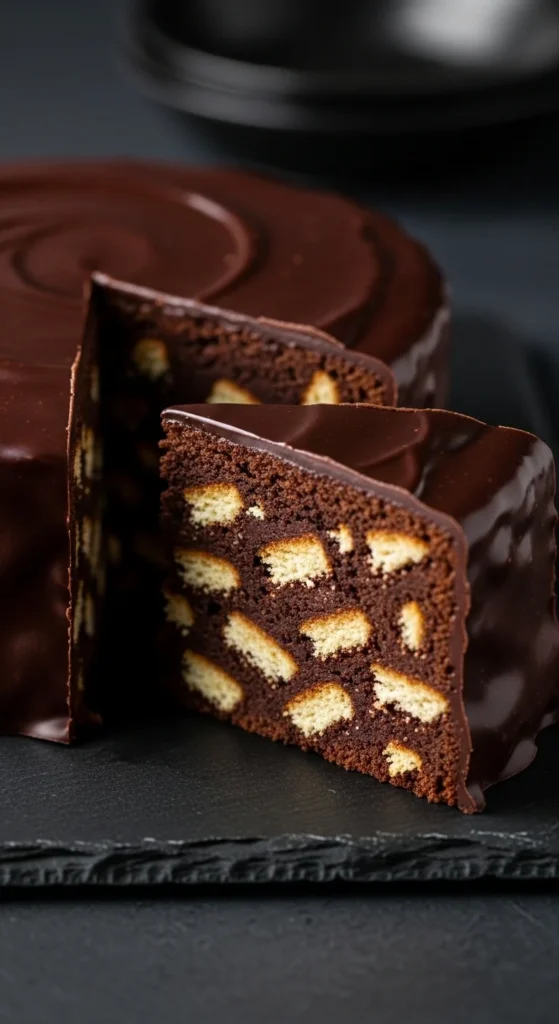 This cake is one of the easiest no-bake desserts, combining simple pantry ingredients into a rich, firm texture. The biscuits soften slightly while still holding shape, giving you a perfect balance between crunchy and smooth. It’s a great option when you want something quick, chocolatey, and reliable without using an oven. It also sets well, making it ideal for slicing and serving clean pieces.