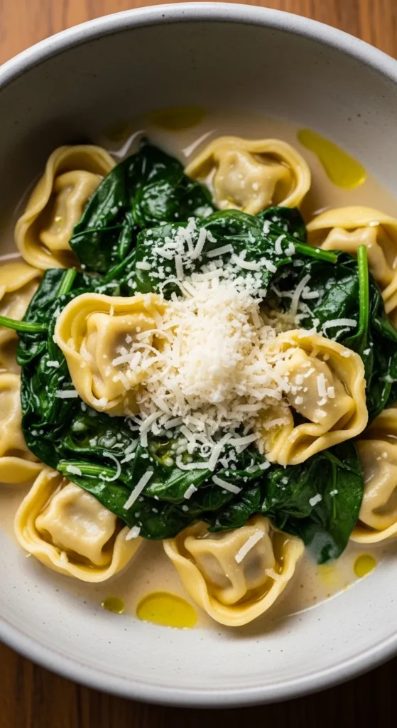 - Add cooked tortellini and parmesan. Season.