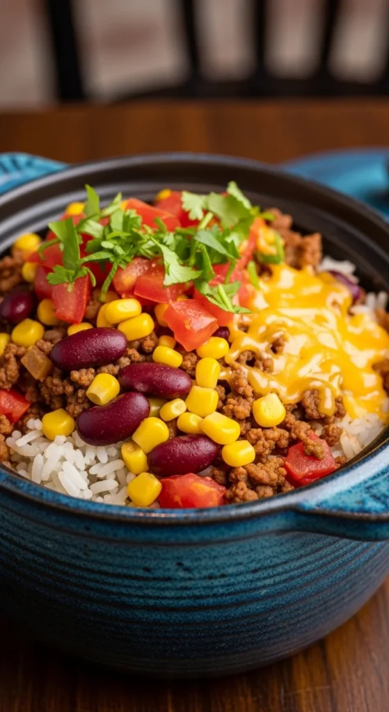 This is a true one pot dinner that families love because it tastes like tacos without the mess. Everything cooks in one pot, so the rice absorbs the seasoned beef and tomato flavor. It is great for busy weeknights and very budget friendly.