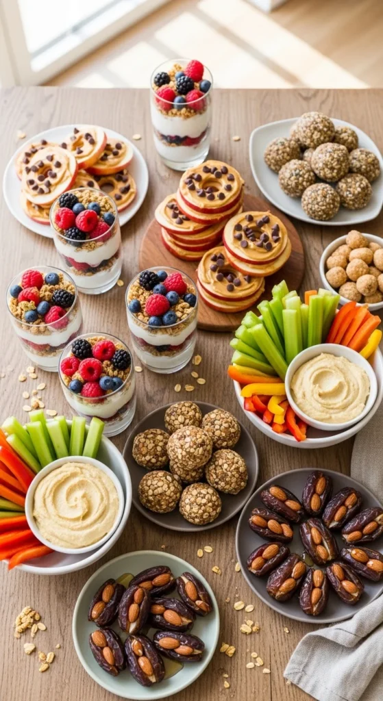 Most of these take about 5 to 10 minutes, which matches what people are searching for right now. Quick, high protein, no bake, and portable. You will see simple ingredients like Greek yogurt, peanut butter, chickpeas, and fruit because they are proven to keep you full and energized. Let’s start with the snacks you can make almost immediately.