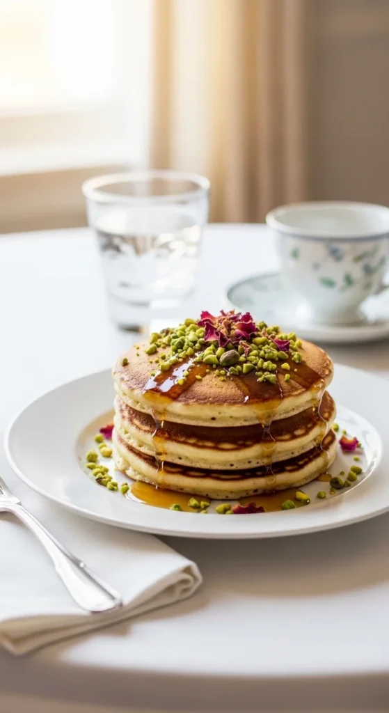 Stack pancakes and drizzle honey or syrup. Garnish with extra pistachios and a few rose petals. Serve warm.