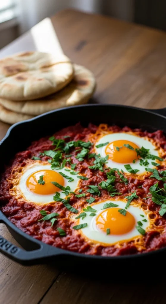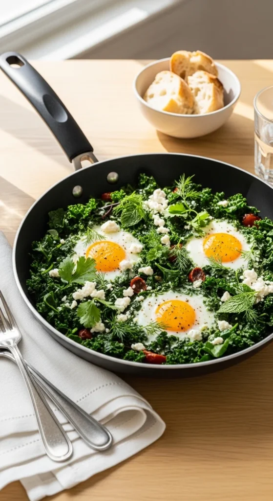 This one feels lighter but still filling. Instead of tomatoes, you get a base of greens and herbs. It’s fresh, aromatic, and perfect when you want variety on the brunch table. Guests often find this version exciting because it looks different from the usual red shakshuka.
