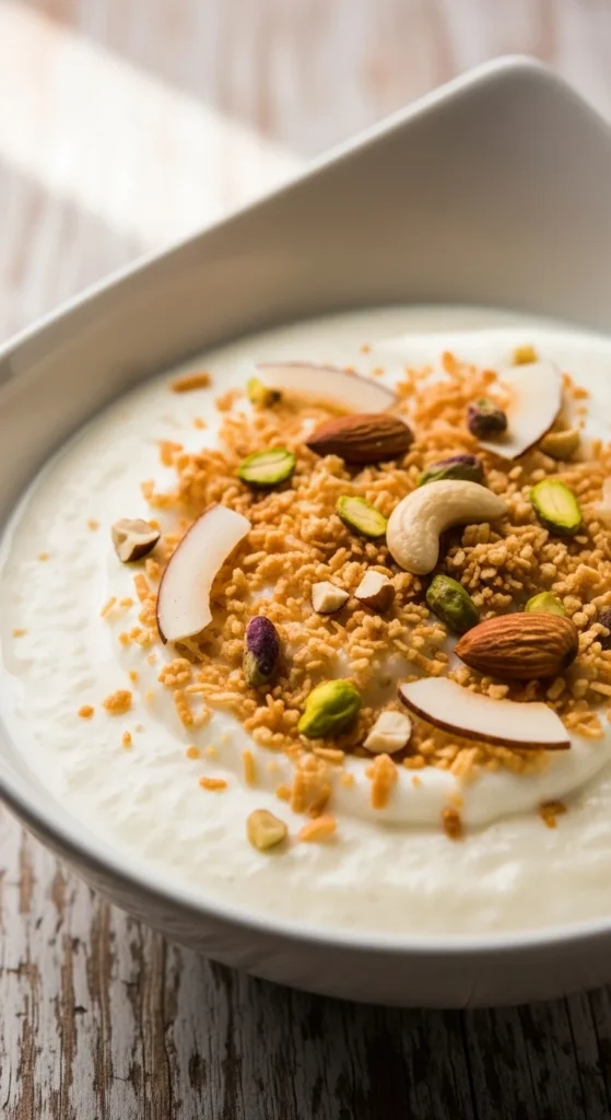 Serve warm in small portions. Garnish with extra nuts and coconut flakes. This pairs well with other milk-based desserts.