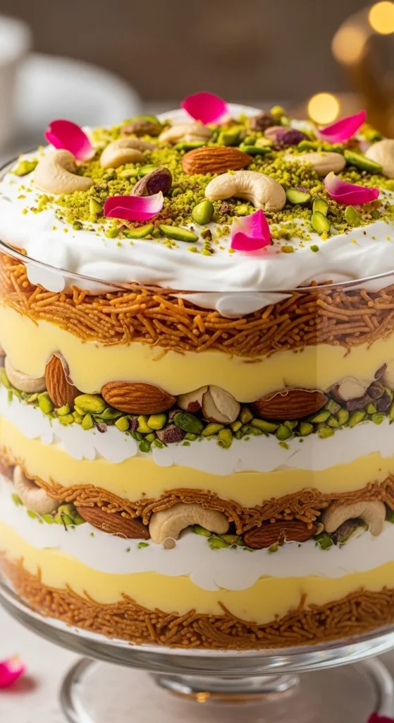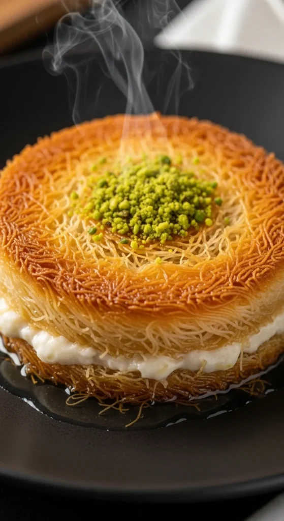 Kunafa with cream filling feels festive and luxurious. The crisp pastry outside and soft creamy center create a beautiful contrast. The light sugar syrup and pistachio topping complete the flavor. It is a lovely dessert for special Eid gatherings.