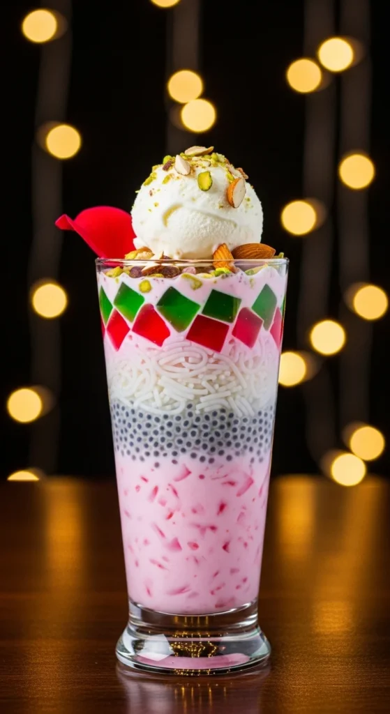 Falooda feels festive the moment it arrives at the table. The mix of rose milk, vermicelli, jelly, and ice cream gives color and texture in every sip. It works as both a drink and dessert. This is a refreshing choice after a heavy meal.
