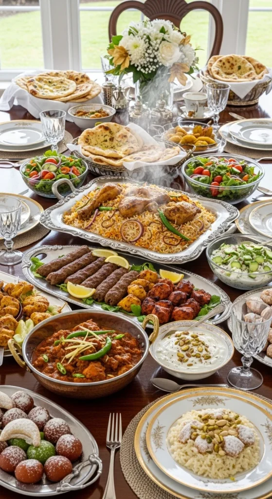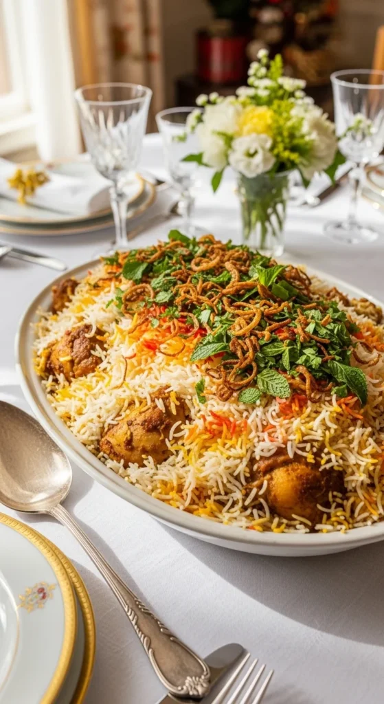 This is the centerpiece of many Eid lunches. Fragrant rice layered with spiced chicken creates a dish that feels celebratory and satisfying. The dum method locks in aroma and keeps the rice fluffy. You can marinate the chicken a day earlier, which makes cooking day much easier.