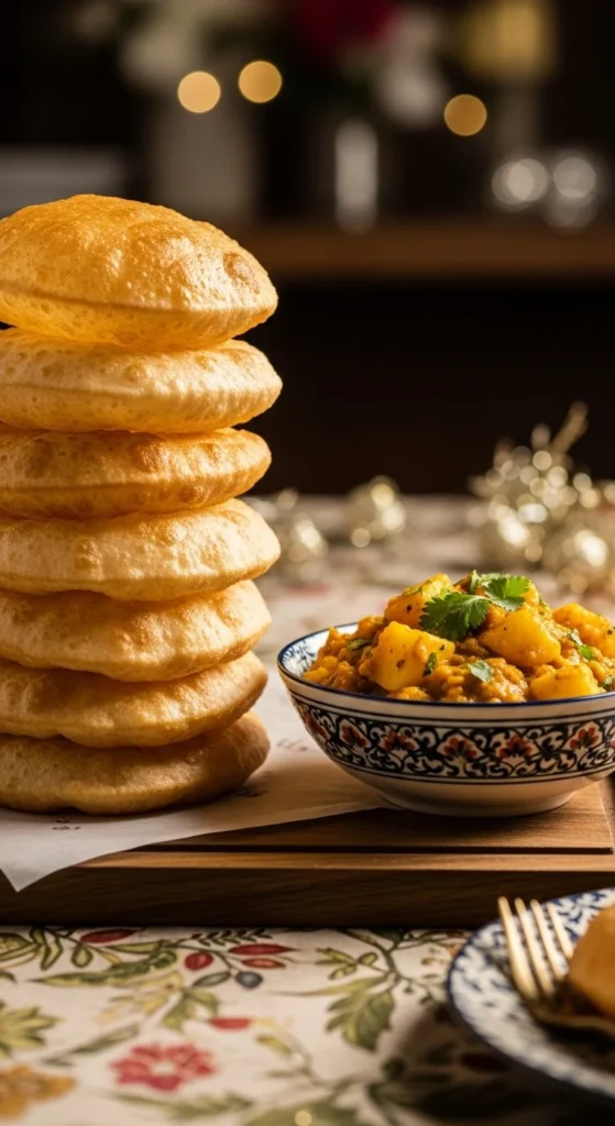 Poori and aloo bhaji bring a classic festive feel. The puffed bread and soft spiced potatoes are comforting and filling. This combination is often enjoyed on Eid mornings but works for lunch spreads too. Fresh pooris always attract guests.
