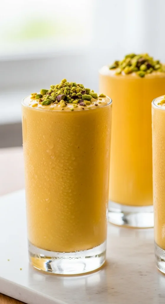 Serve chilled in glasses. Garnish with pistachios or saffron. Best served fresh.