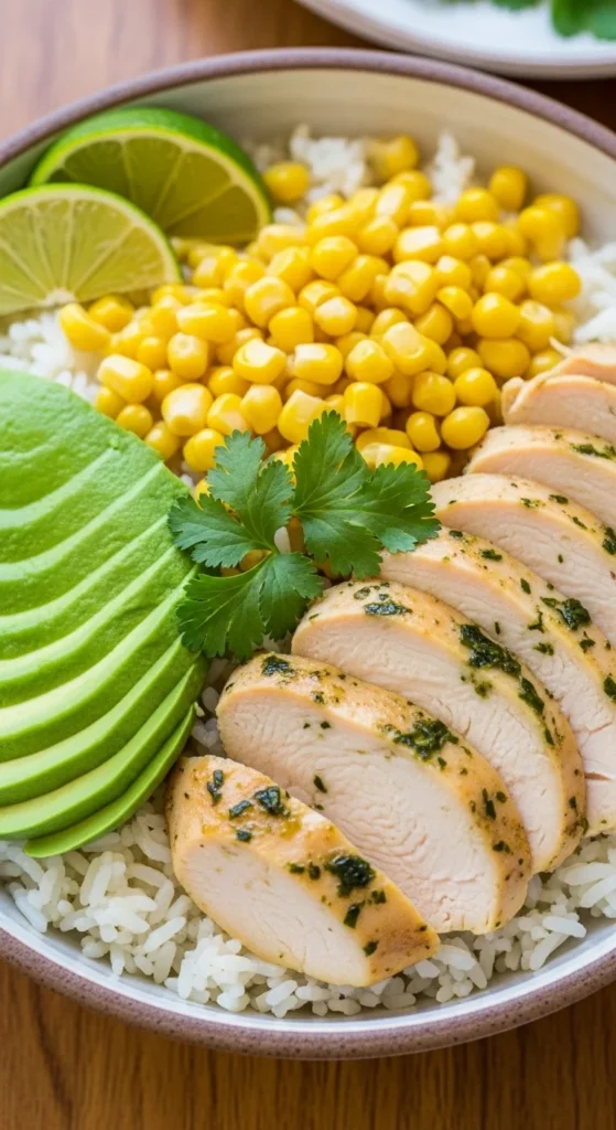 - Build bowls with rice, beans, corn, and avocado.