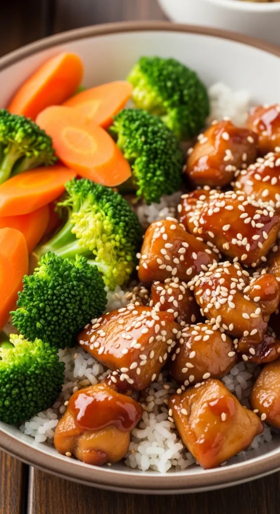 - Assemble bowls with rice, chicken, and veggies.