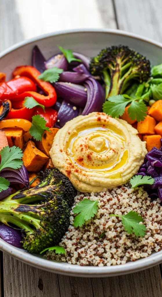 If you want healthy bowls recipes that don’t feel boring, this is it. Creamy hummus plus roasted veggies makes everything taste rich and satisfying.