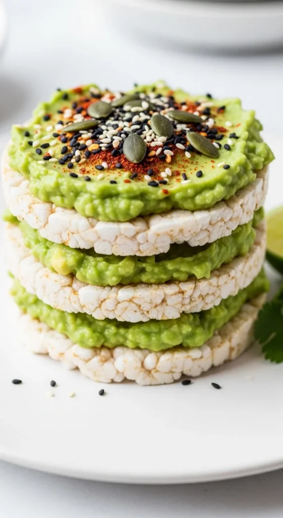 Eat right after assembling so the rice cakes stay crisp. Adding just a thin layer of avocado keeps it balanced instead of too heavy.