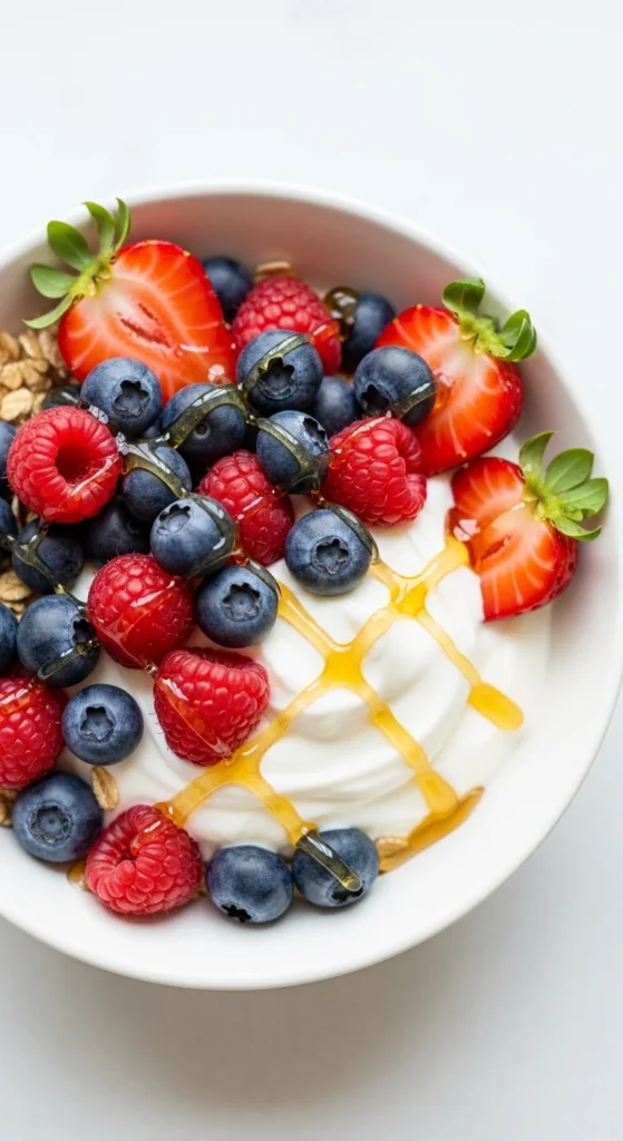 This is one of the easiest ways to stay full between meals. You get high protein from the yogurt and natural sweetness from the berries, so it actually feels like a treat without going heavy.
