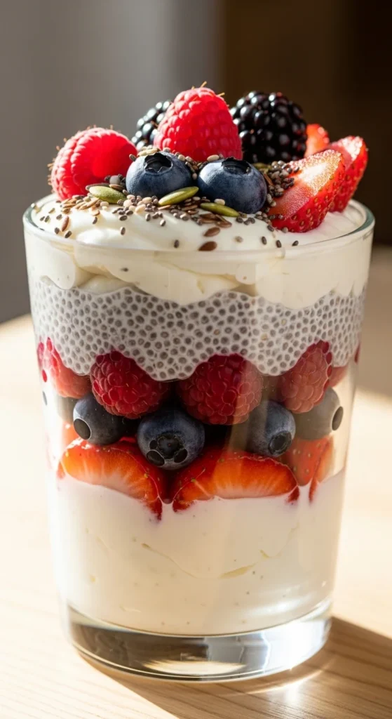 This one feels a bit more put-together but still takes almost no effort. The chia seeds add extra fiber, so it keeps you full longer than a regular yogurt snack.
