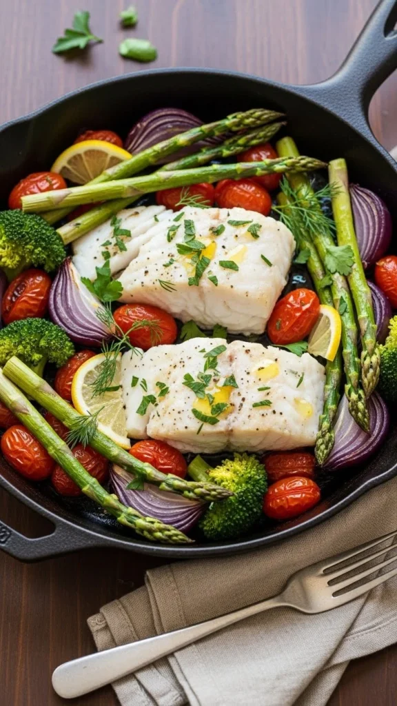 Baked fish pairs well with vegetables and cooks beautifully in one dish.