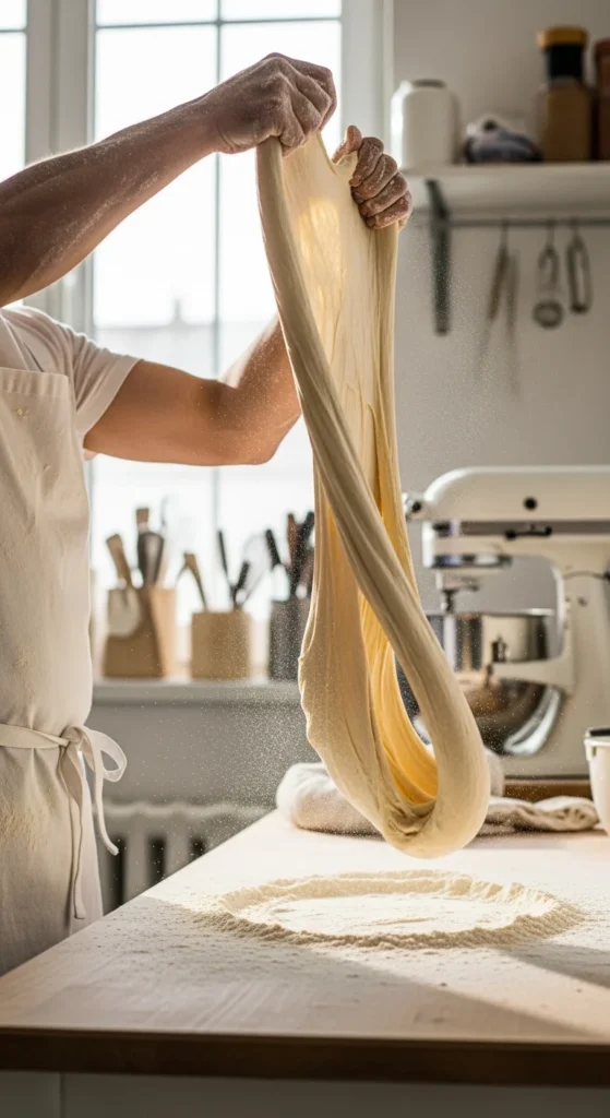 [Image Prompt: fingers stretching dough thin enough to see light through it for windowpane test]