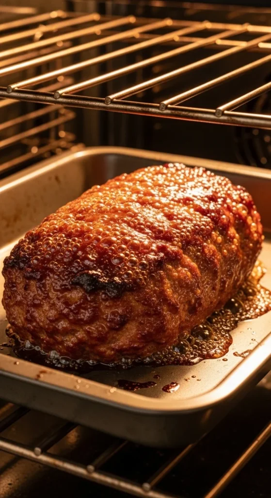 The glaze should caramelize, not burn. Meatloaf is done when internal temperature reaches 160°F (71°C).