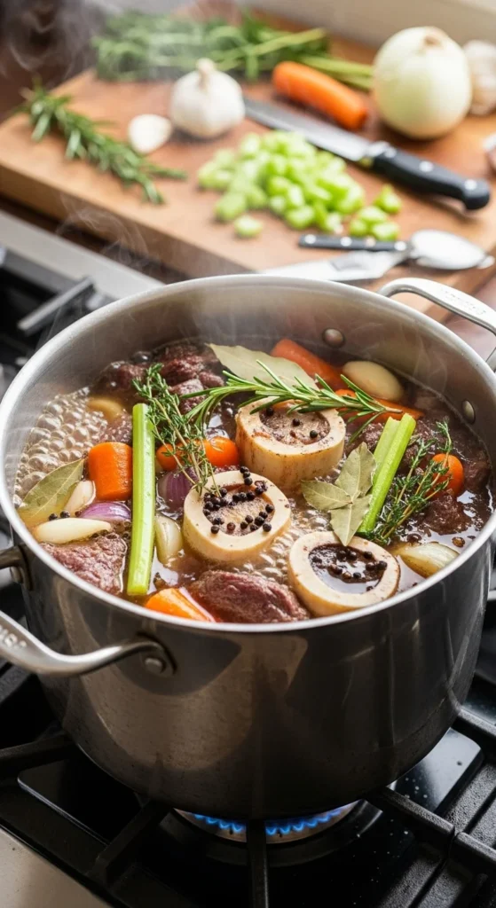 During the first 30 to 45 minutes, foam and impurities will rise to the surface. Skim these off using a spoon. This step is essential for clarity and clean flavor.