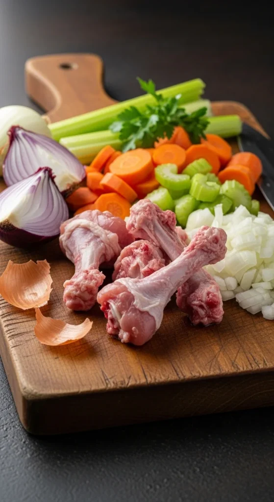 Bones are the backbone of a rich broth. They provide flavor, body, and natural gelatin. Use bones with connective tissue and joints, such as chicken backs, wings, necks, beef knuckles, marrow bones, or leftover rotisserie chicken frames.