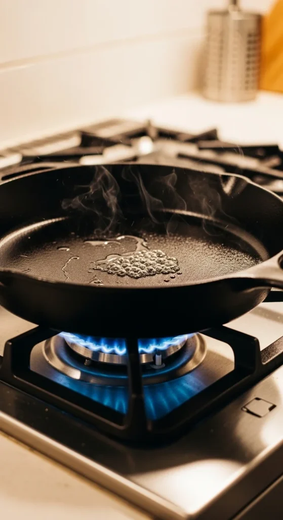 Use a thin layer, not a pool. The pan should shimmer, not smoke heavily.