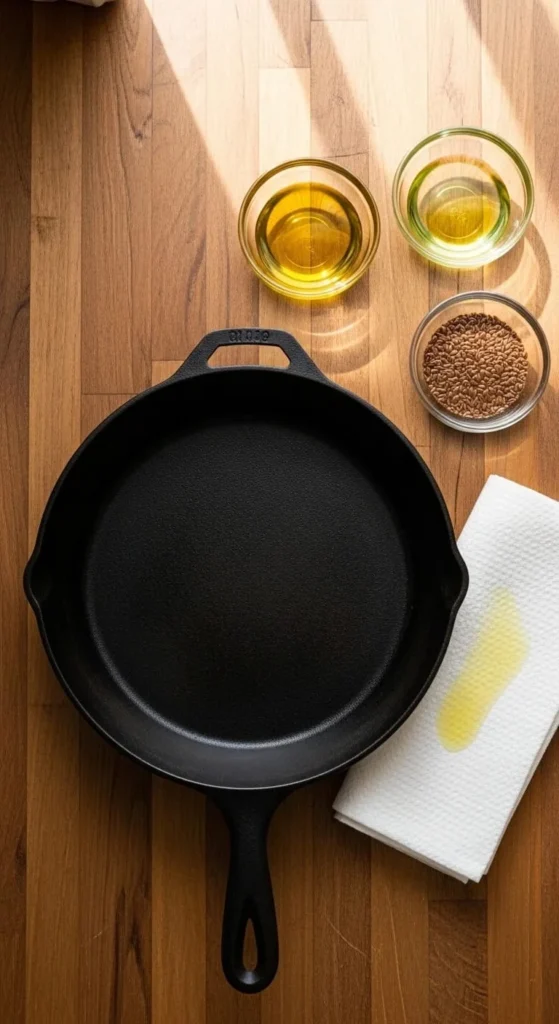 Before seasoning, the skillet must be completely clean and dry. Any moisture left on the surface can cause rust or interfere with oil bonding.