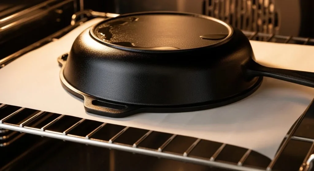 Baking upside down prevents oil from pooling inside the pan and creates an even seasoning layer.