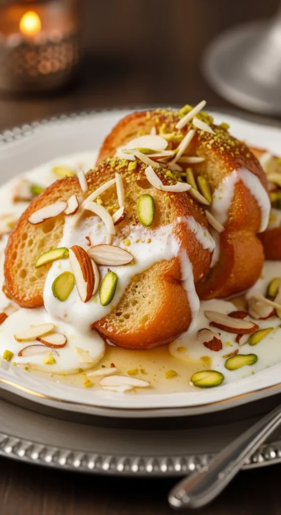 Shahi Tukda feels royal from the first bite. Fried bread soaked in syrup and creamy rabri makes it rich and indulgent. It is perfect when you want a dessert that looks impressive without complex steps. Guests often recognize it instantly and smile.