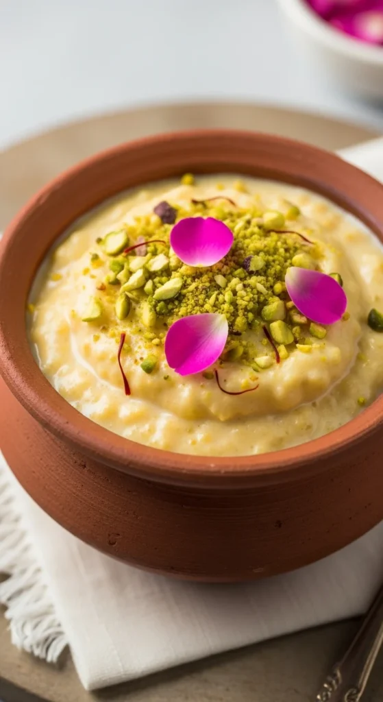 Serve cold. Garnish with nuts or rose petals. Clay bowls add a traditional touch.