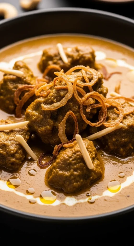 Serve hot with naan or sheermal. Garnish with nuts or a drizzle of cream. A squeeze of lemon balances the richness.