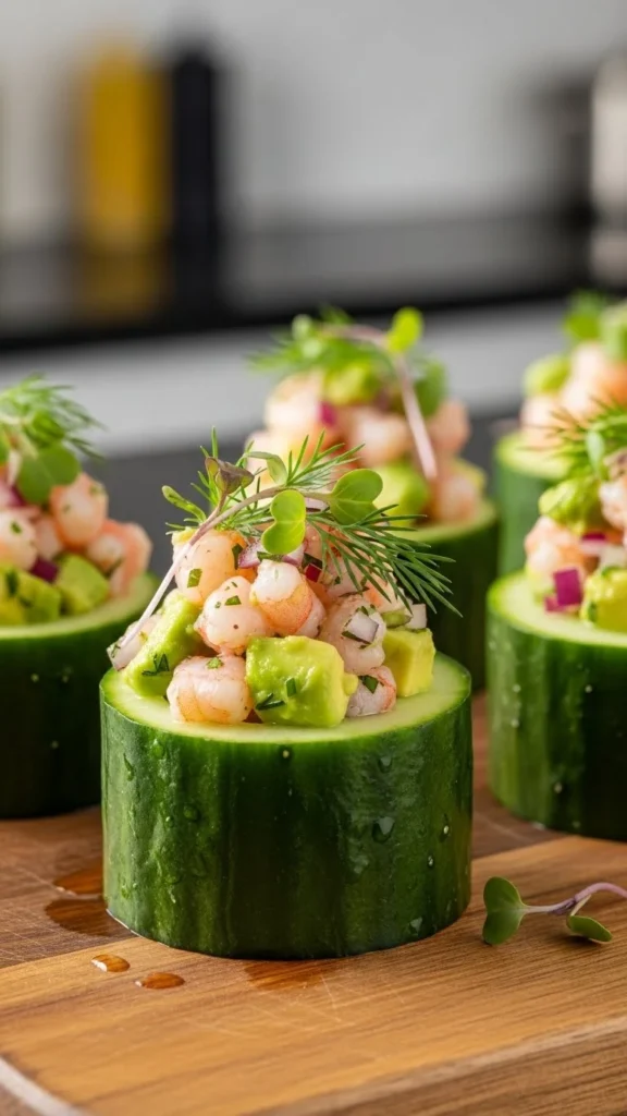 These cucumber cups are fresh, creamy, and filled with juicy shrimp and smooth avocado. They offer a refreshing, cool bite that contrasts nicely with richer appetizers. Perfect for guests who enjoy seafood with clean, crisp flavors.