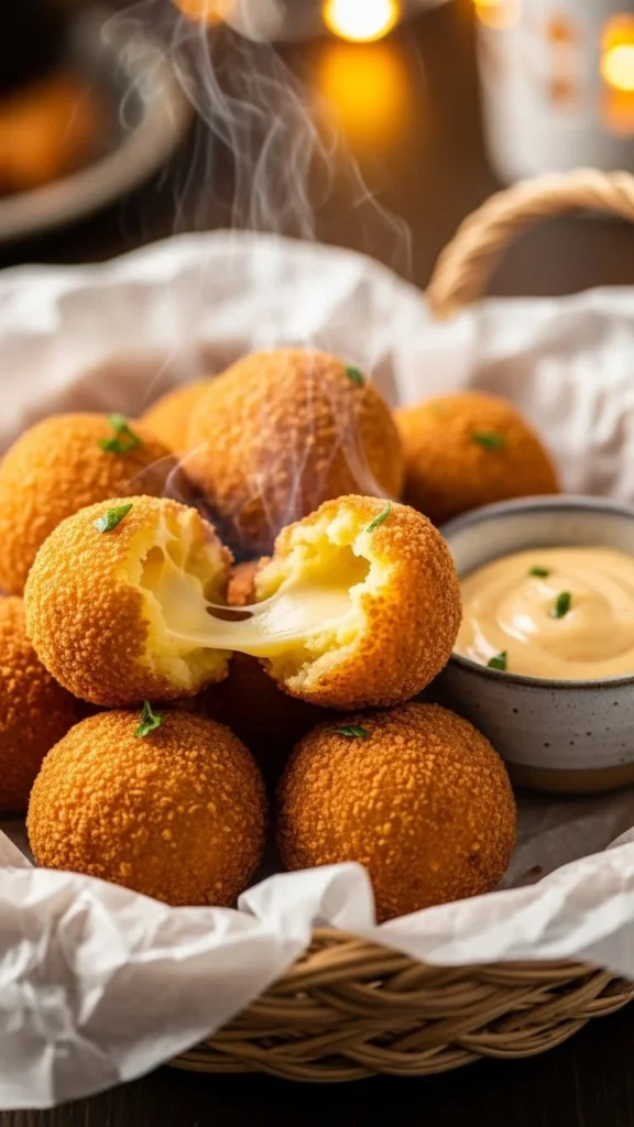 These potato cheese balls are golden, crispy, and filled with gooey cheese that stretches beautifully when bitten. They’re comforting and extremely popular among guests of all ages. Perfect for winter gatherings where hot appetizers shine.