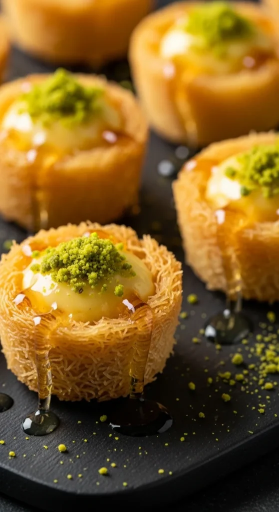 Kunafa cups give you the flavor of traditional kunafa without making a large tray. The small portions bake faster and are easier to serve. Using ready kunafa dough keeps prep simple. These look festive on an Eid dessert table.