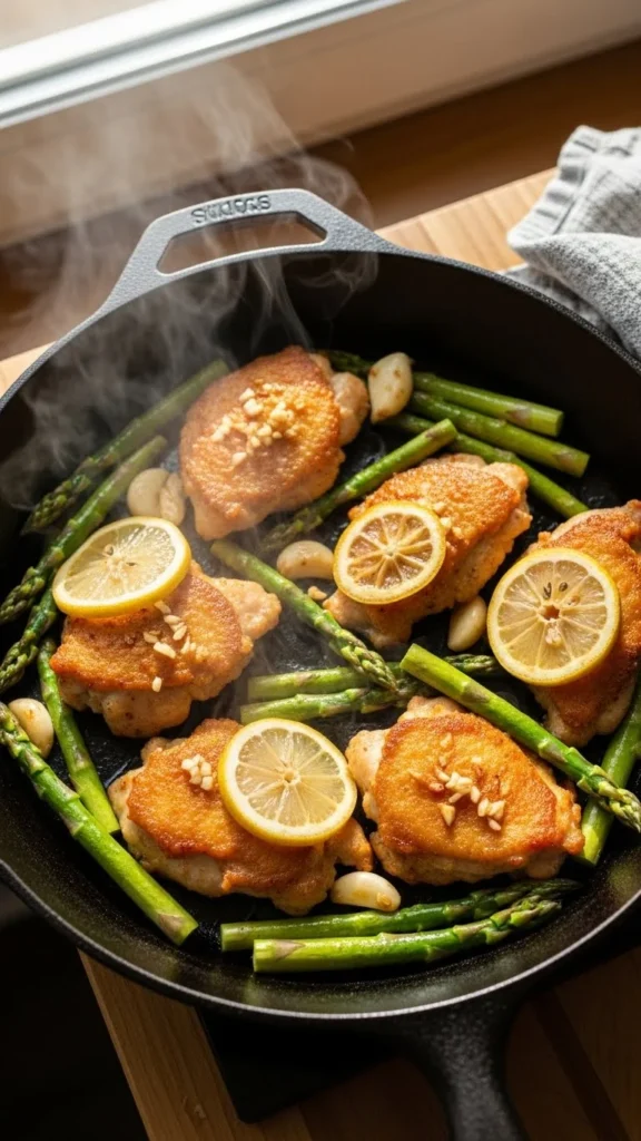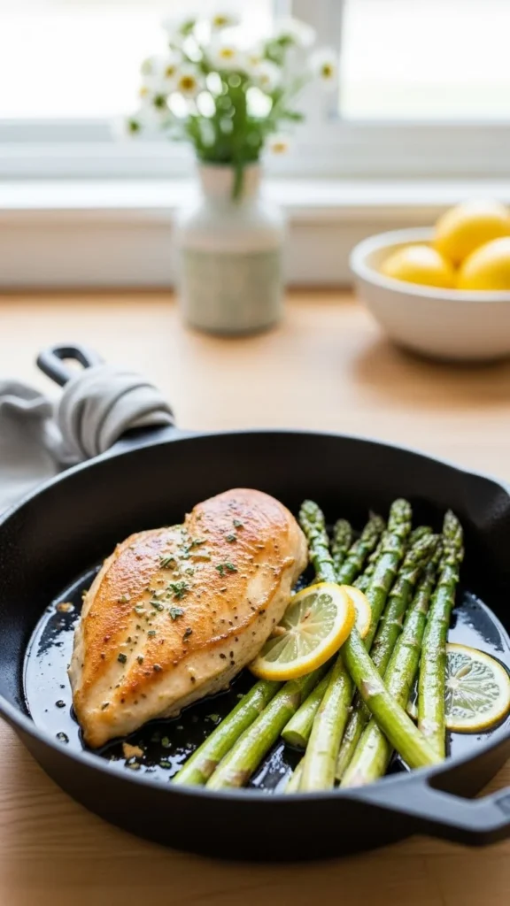 This is the kind of lunch you make when you want something cooked but not heavy. Chicken and asparagus cook in the same pan, and lemon keeps the flavors sharp and clean. It is filling enough to hold you through the afternoon without feeling like a full dinner.