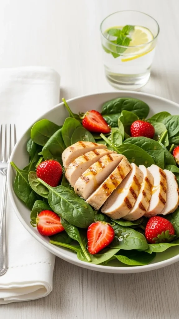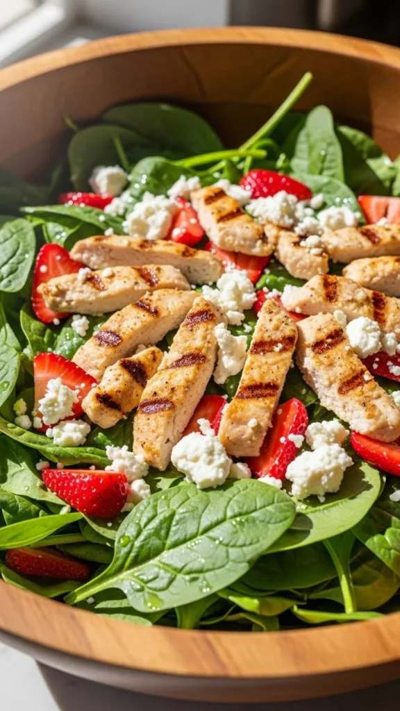 This salad balances sweet and savory without feeling complicated. Chicken makes it filling, while strawberries keep it bright and seasonal.
