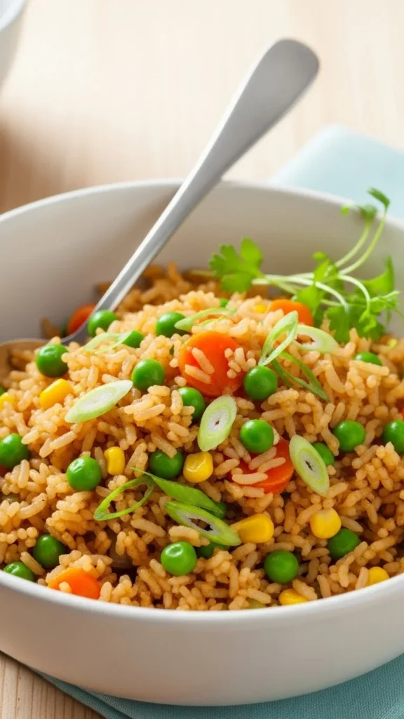 This is a fast lunch that helps use leftover rice. Vegetables add freshness, and the dish comes together quickly without feeling greasy.