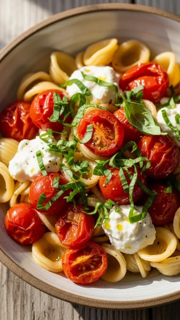 This pasta is about contrast. The tomatoes roast until sweet and jammy, while ricotta stays cool and creamy. It feels light but still satisfying, and it works well when tomatoes are at their best.