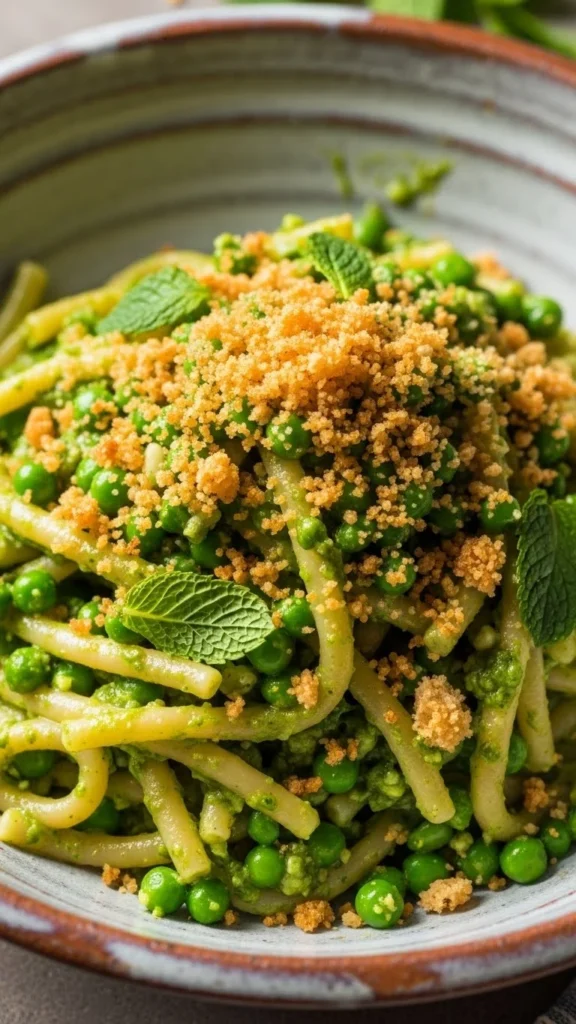 This pasta is fresh and slightly sweet from the peas, with mint giving it a clean finish. The breadcrumbs add texture so the dish does not feel flat.