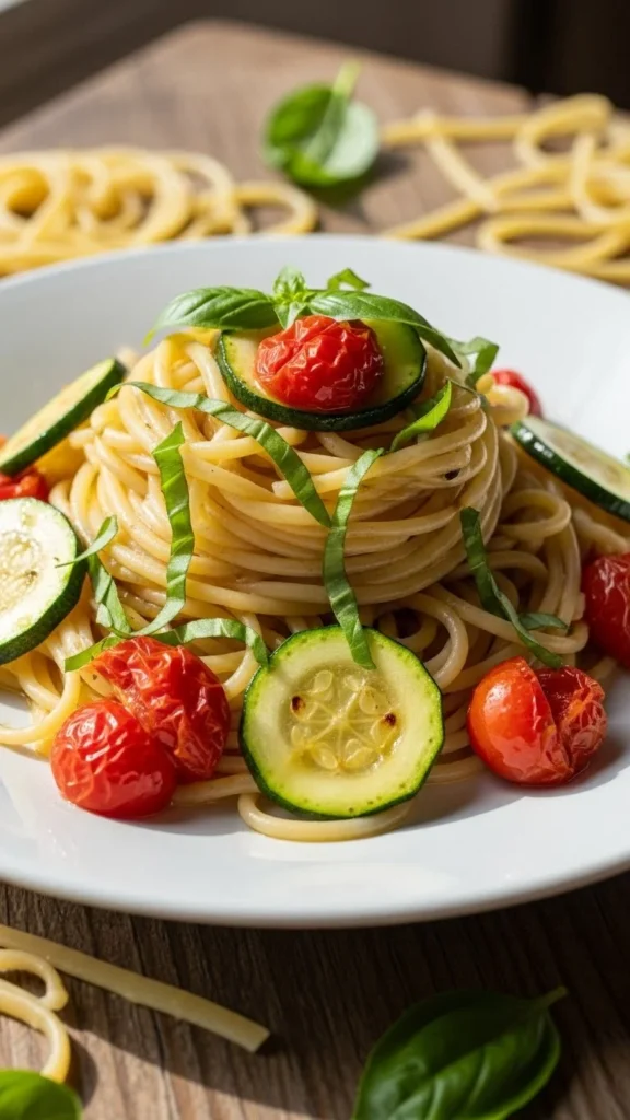 This pasta relies on quick cooking and good timing. Zucchini stays tender, tomatoes soften just enough, and basil brings everything together.