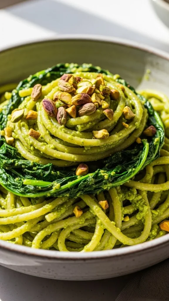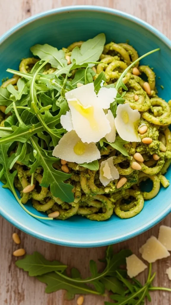 This pasta uses arugula for a slightly peppery bite that keeps the dish from feeling heavy. The pesto coats the pasta lightly instead of drowning it.