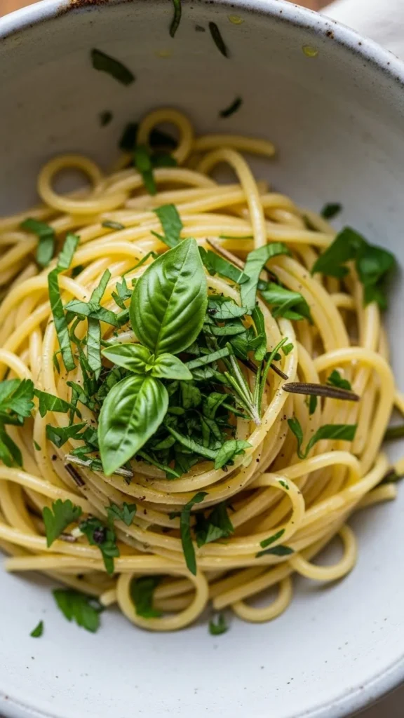 - Stir in herbs and a splash of pasta water.