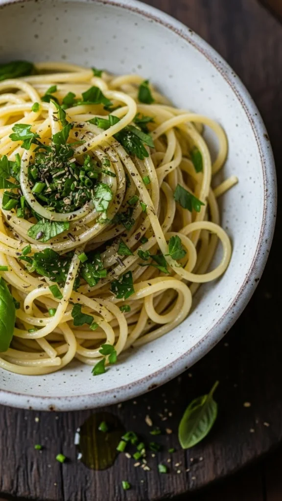 This is a flexible pasta that works with whatever vegetables you have. Olive oil is the base, so the vegetables and herbs stay front and center.